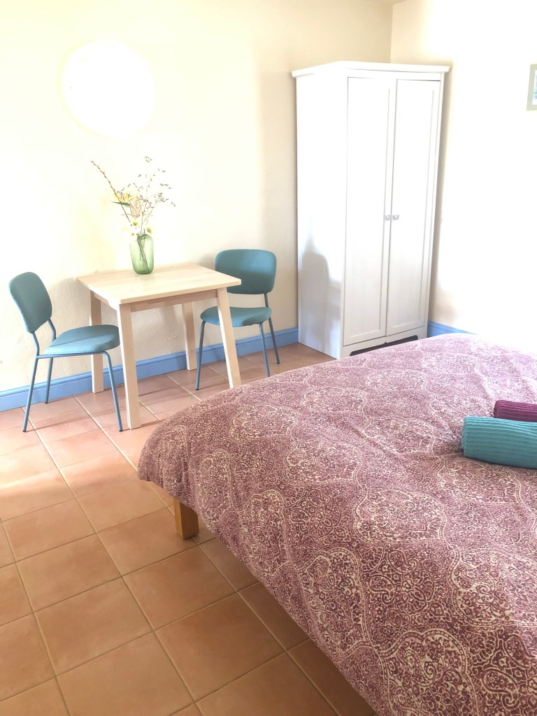 Our largest ‘family’ room (15.7 sq. ms.) on the ground floor with double bed, tiled floor, free standing wardrobe, private bathroom and direct access to our shady courtyard. It has capacity for 2 adults and 2 children (in a bunk bed). €10 per child per night extra, above the standard price.